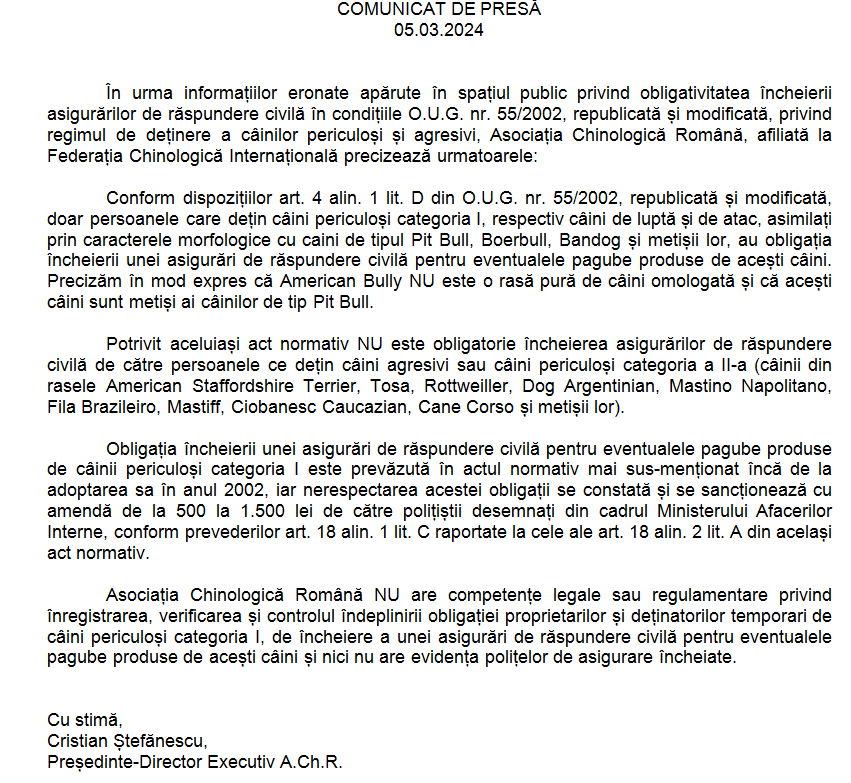 - Pozitie oficiala AChR si recomandarile legate de ocupatia de crescator caini